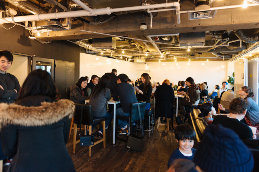 イベント前に訪れた「FabCafe」では、群馬在住でカルフォルニア出身の水彩画アーティストKevin Fosterに出会う。その後、友人のAlvaro Arreguiと今回の会場となるクリエイティブ・ラウンジスペース「loftwork COOOP」へ。道玄坂の頂上に位置する会場からの景色はビルに脅かされてはいるものの、美しい。窓越しから撮影に夢中になっているうちに会場は次第に賑わいだし、アーティストたちの空間が生まれた。
